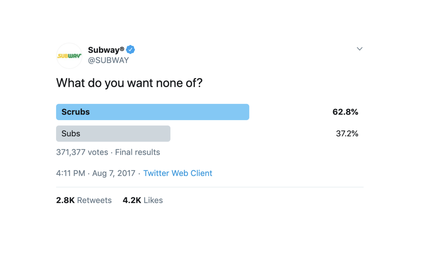 I wrote this Twitter poll for Subway in hopes that at least a few of the bro-lenniels of the internet might catch the reference.